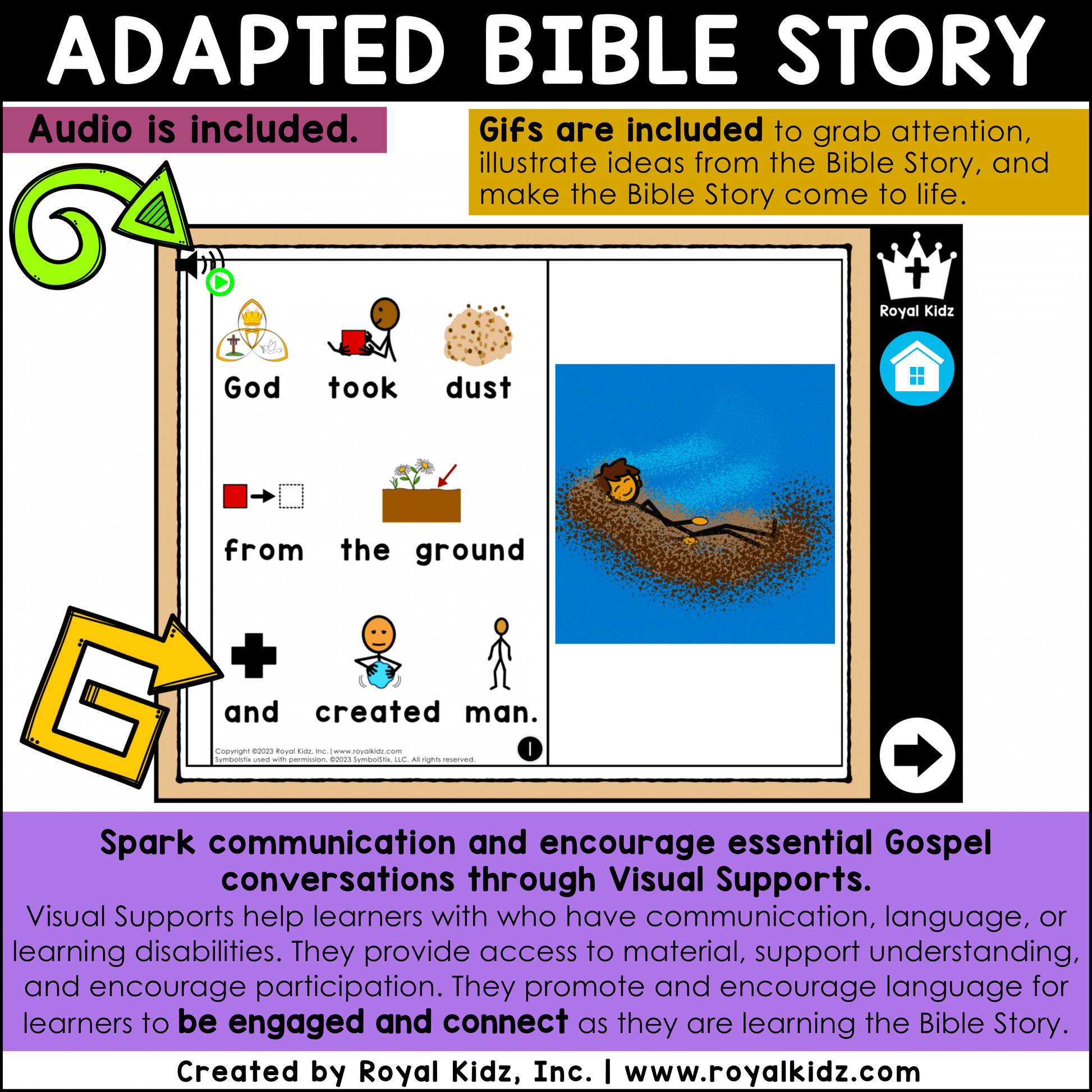 Visual Supports help learners with who have communication, language, or learning disabilities. They provide access to material, support understanding, and encourage participation. They promote and encourage language for learners to be engaged and connect as they are learning the Bible Story at home, church, or school.