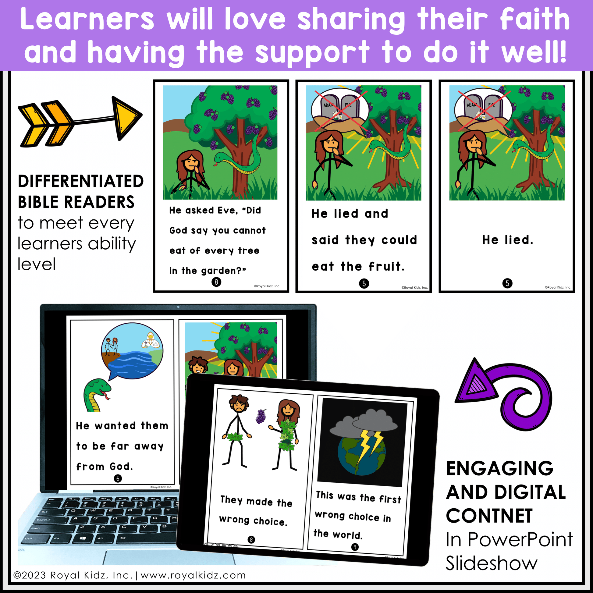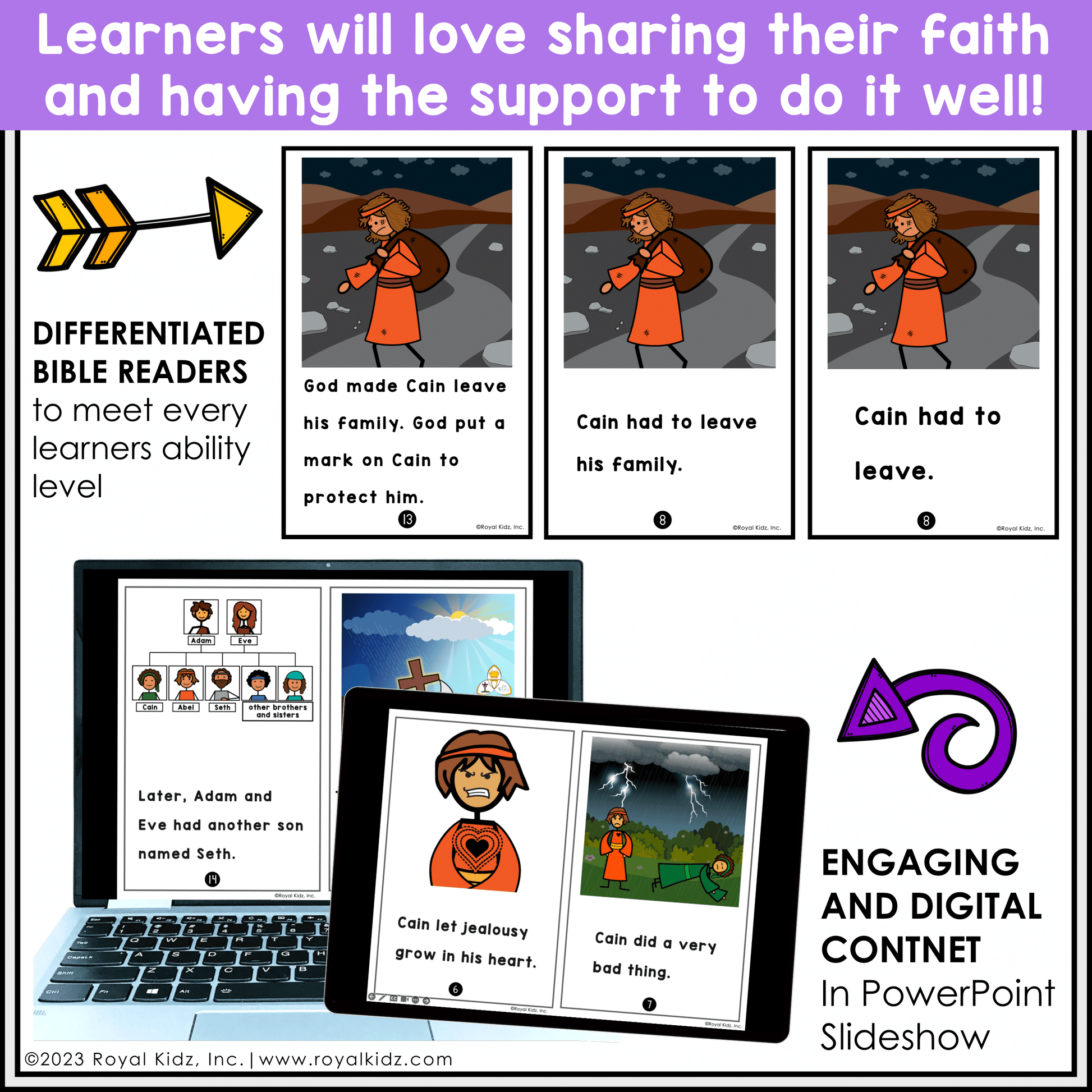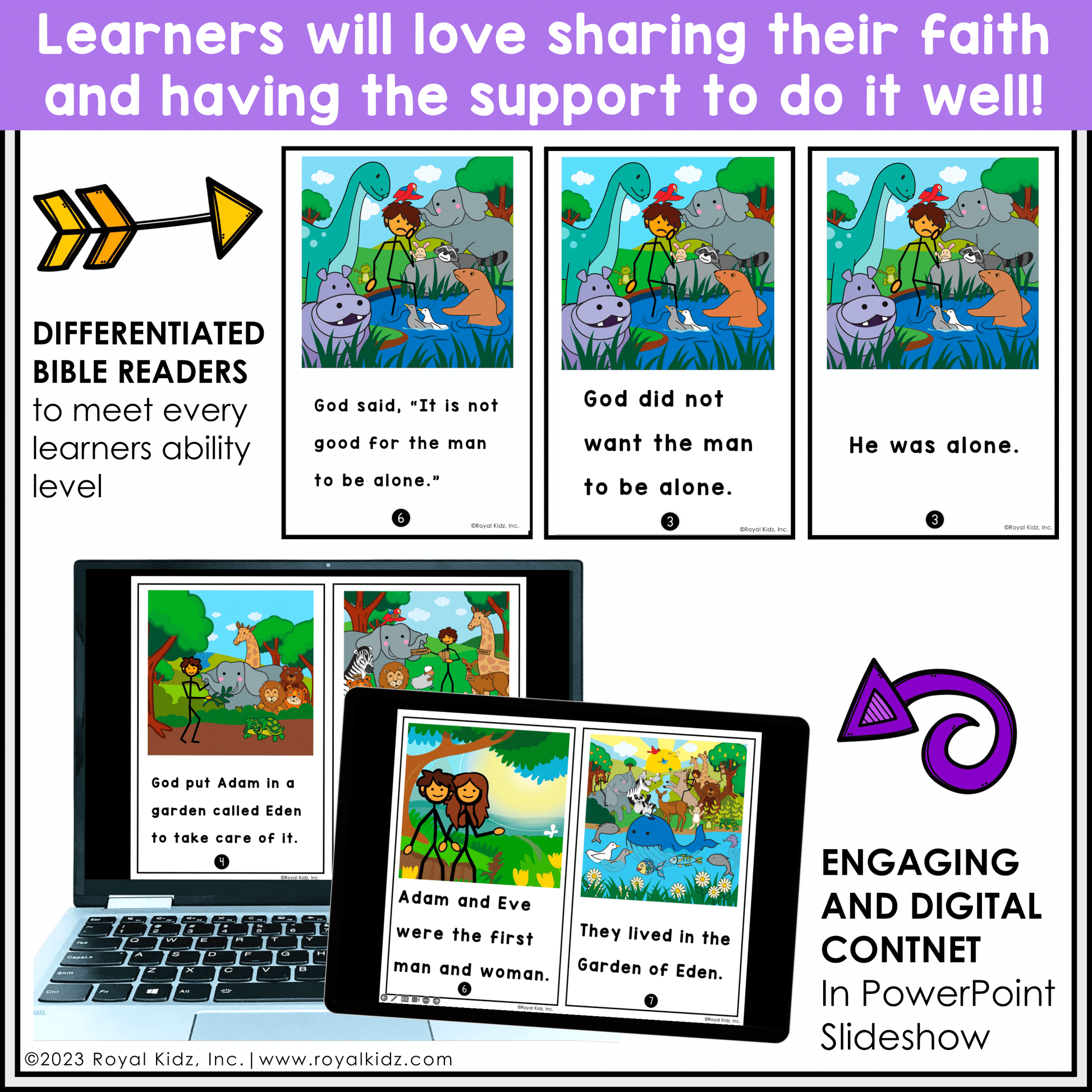 The Beginning Bible Stories Set 1 Bundle Bible Readers provides access to material that supports Bible reading comprehension and encourages participation. It allows ALL learners to be engaged and connect to our Lord and Savior, Jesus Christ, as they learn the Holy Bible.