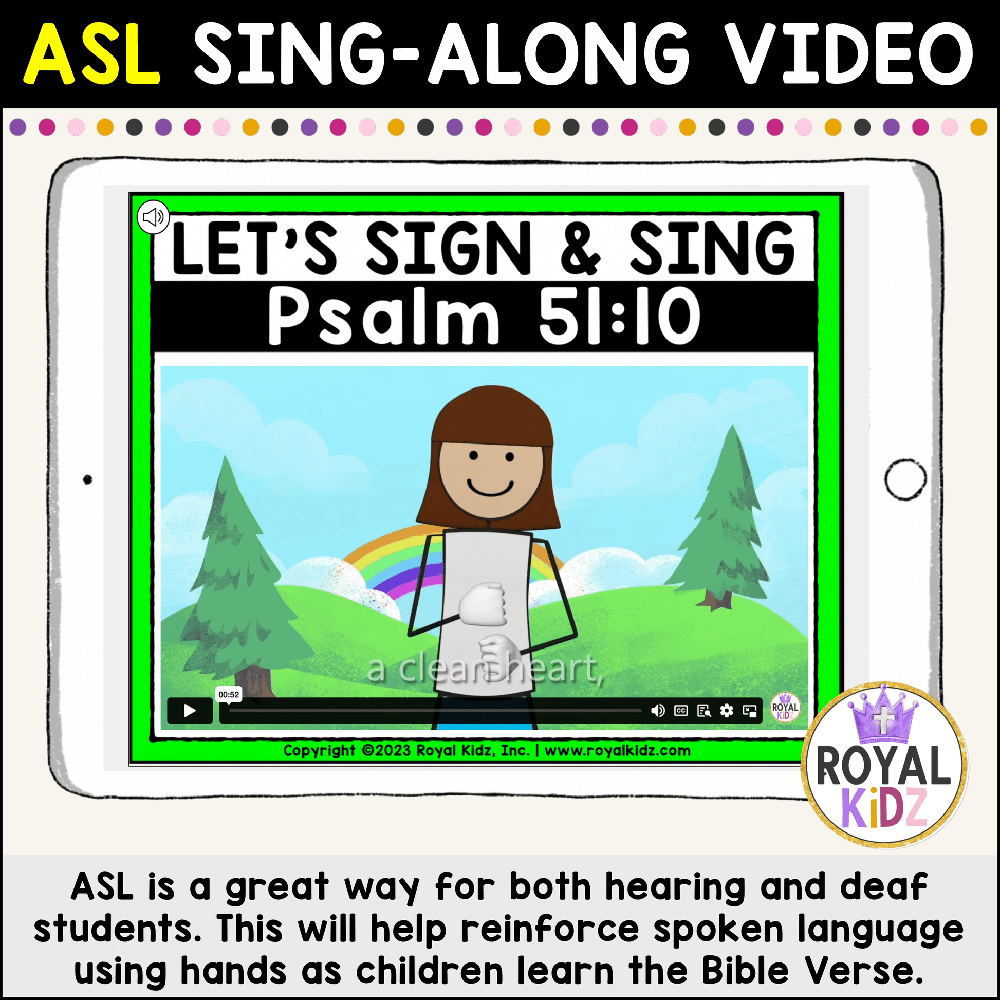 The ASL Sing-Along Video is perfect for students who are learning ASL sign language, are nonverbal, and need an alternative way to communicate. The Bible Verse ASL sing-along video provides a new way to learn, instead of words, to be engaged and communicate the Bible Verse. It also opens up opportunities to have discussions for singing and spreading sign language awareness to peers who are not deaf or are hearing impaired.